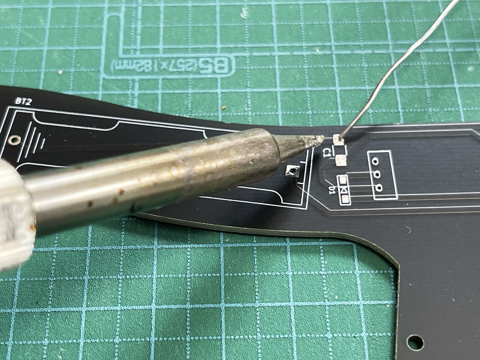 コンデンサをピンセットで押さえながら、予備ハンダを溶かしてコンデンサを基板に固定します。