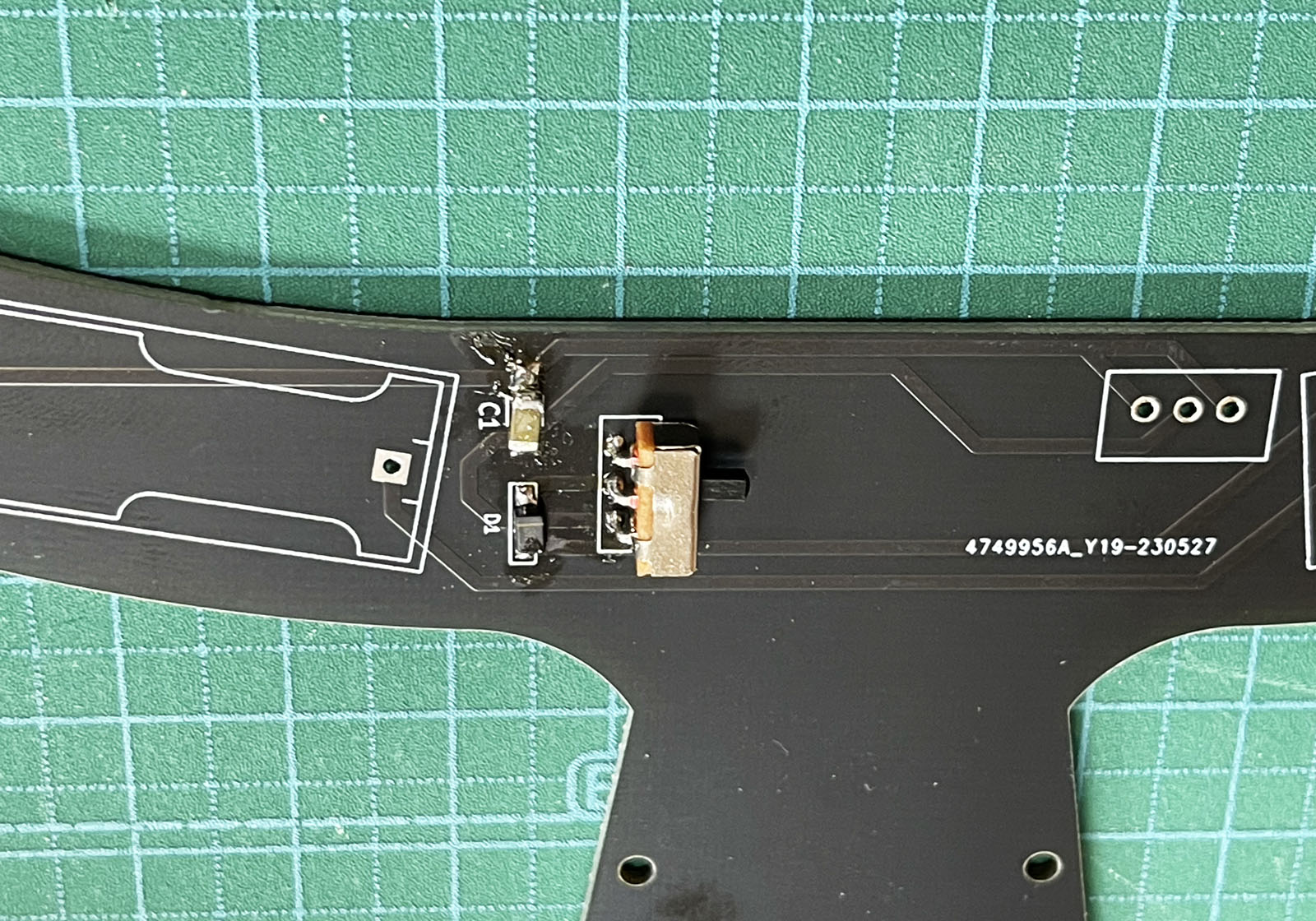 バッテリー用スルーホール中央の穴に黒のコードを、左右の穴に白いコードをハンダづけします。