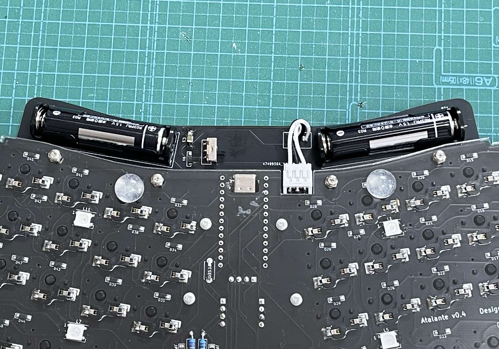 Atalante X は無線接続用の電源として本体内蔵のボタン電池CR1632を使用する設計になっていますが、Manatite電池基板を装着することで、入手性のいい単4電池を使用できるようになります。